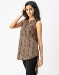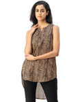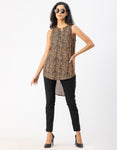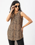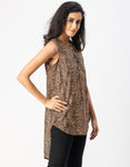 Features: Sleeveless, Mandarin Collar, Long, Regular Fit, Plastic Button, High-Low Top, Lightweight, All Over Printed Pattern.