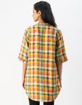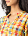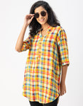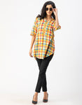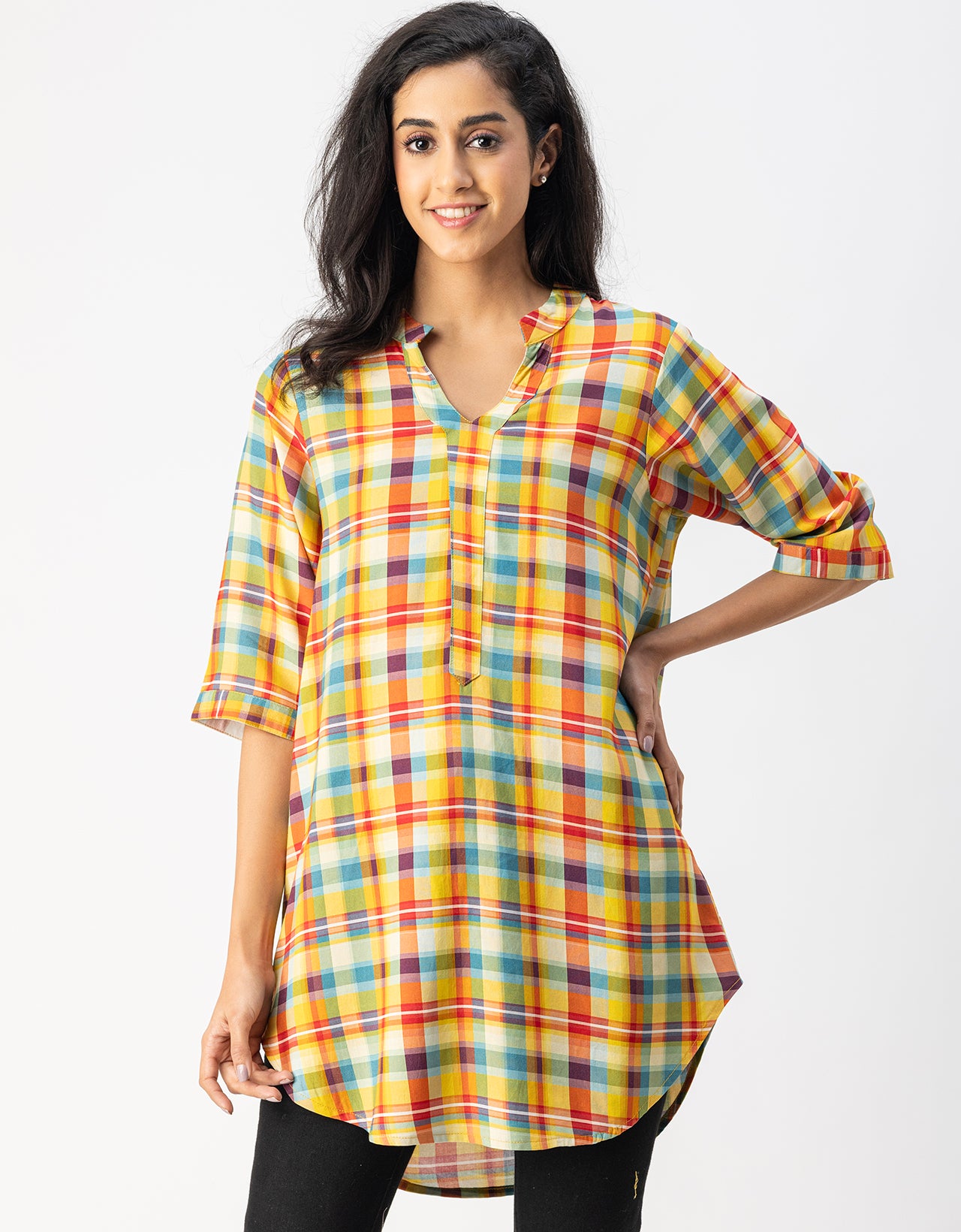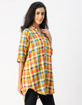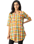 Features: Three Quarter Sleeves, Mandarin Collar, Plastic Button, Long, Relaxed Fit, Regular Length, Lightweight, All Over Printed Pattern.
