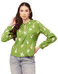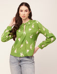 Features: Soft Feel Tie Up V Neck Long Puffed Sleeves Straight Cut Regular Length Lightweight And All Over Printed Pattern