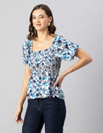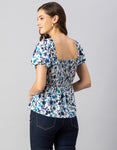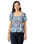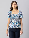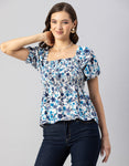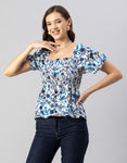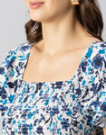 Features: Puffed Elbow Sleeves, Square Neck, Smocked Bust, Ruffled, Waist Length, Lightweight And All Over Printed Pattern