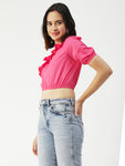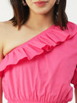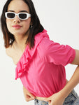 Features: single shoulder, elbow sleeve, cropped length, frilled pattern, body fitted, lightweight and all over printed pattern