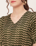 Features: Short Sleeve, V-Neck, Wooden Button On Front, Regular Length, Lightweight, All Over Printed Pattern.