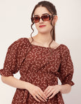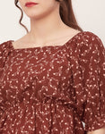 Features: Short Puff Sleeve, Square Neck, Short Length, Flared Hem, Lightweight, All Over Printed Pattern.
