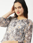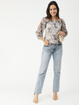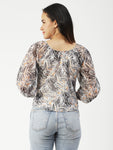 Features: round neck, long balloon sheer sleeves, waist length, lightweight and all over printed pattern