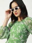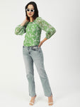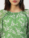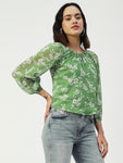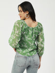 Features: round neck, long balloon sheer sleeves, waist length, lightweight and all over printed pattern