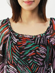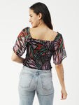 Features: square neck, short flutter sleeves, cropped length, smocked, lightweight and all over printed pattern