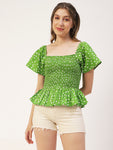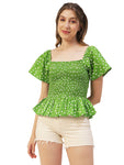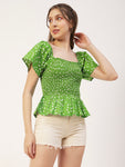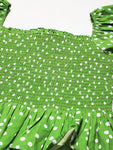 Features: square neck, short sleeves, smocked, short length, lightweight and all over printed pattern