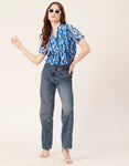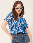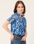 Features: V Neck, Short Sleeves, Pleated Front, Short Length, Lightweight And All Over Printed Pattern