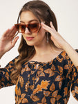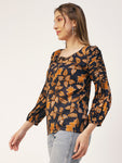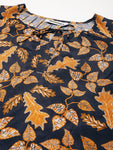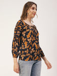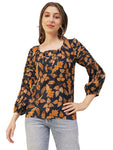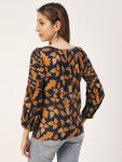 Features: V neck with ties, long balloon sleeves, waist length, loosely- fitted, Pintuck details on sleeve, lightweight and all over printed pattern