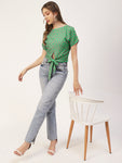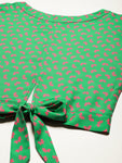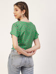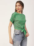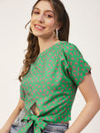 Features: round neck, short sleeves, front knot, cropped length, lightweight and all over printed pattern