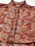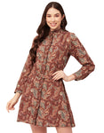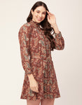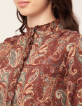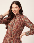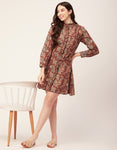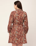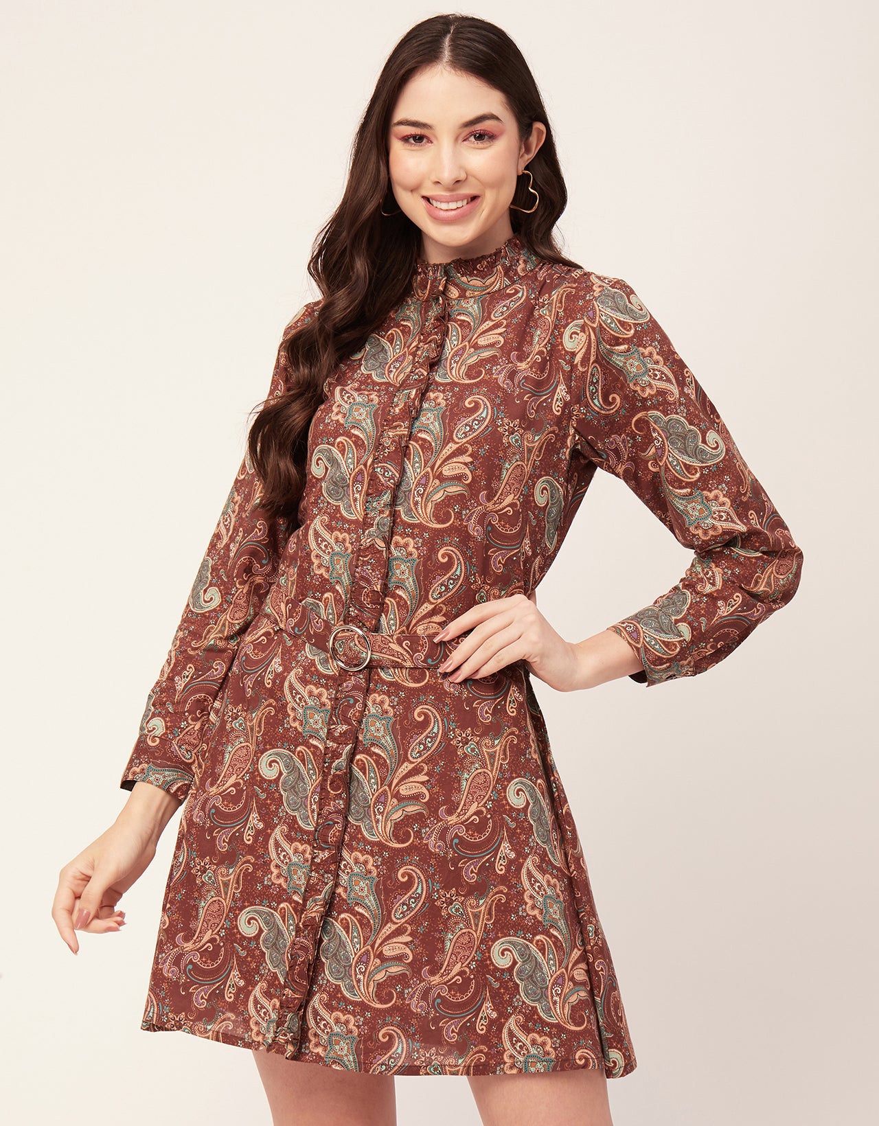 Features: Fabric Belt With Metal Buckle Front Buttoned Collared Cuffed Long Sleeves Ruffled Collar Flared Hem Short Length Lightweight And All Over Printed Pattern