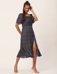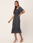 Features: Short Sleeve, Ruffle Style, Square Neck, Knee Length, Side Slit, Lightweight, Flared Ruffle Hem, All Over Prints.