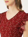Features: V neck, short sleeves, front slit, fitted waist, ruffled hem, calf length, lightweight and all over printed pattern