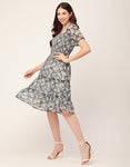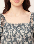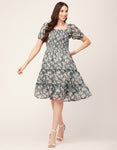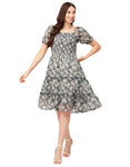 Features: Smocked Puffed Sleeves Square Neck Tiered Hem Knee Length Lightweight And All Over Printed Pattern