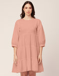 Features: Side Zipper Round Neck Tiered Hem Back Button Closure Quarter Sleeves Knee Length Lightweight And Solid Colors.